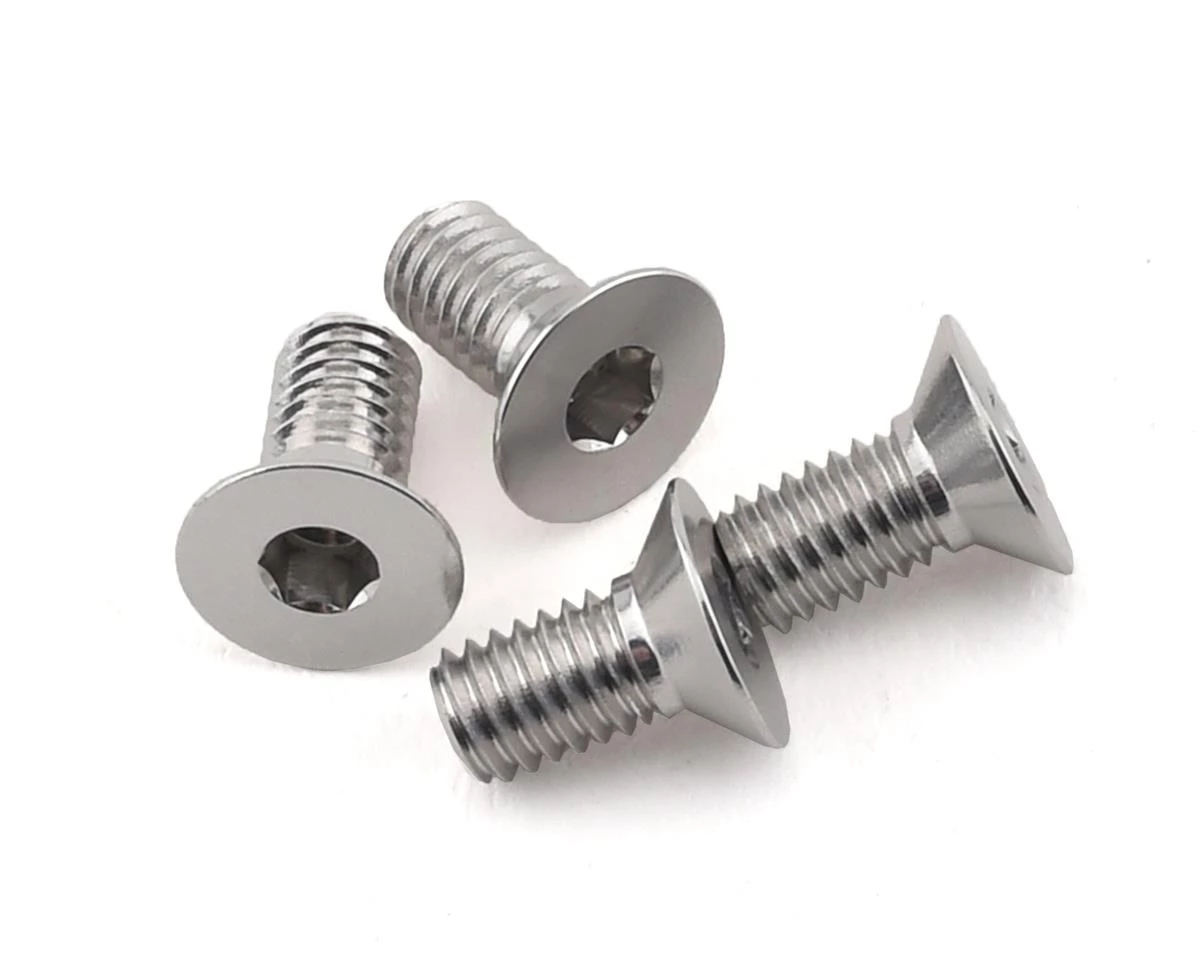 This is a pack of four Yokomo 3x6mm BD9 Flat Head Hex Screws, in Aluminum Alloy material. These screws are extremely light, as Aluminum is lighter than Titanium, but not as strong as Ti. Recommended for on-road, low stress applications.