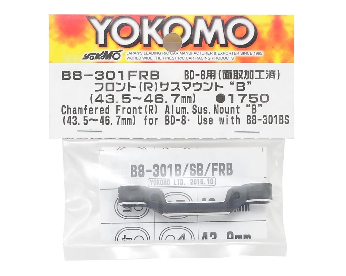 This is an optional Yokomo Aluminum Front-Rear Suspension Mount B. This mount requires bushing YOKB8-301BS and provides 43.5mm between 46.7mm of space between hinge pins, depending on the orientation of the bushing.