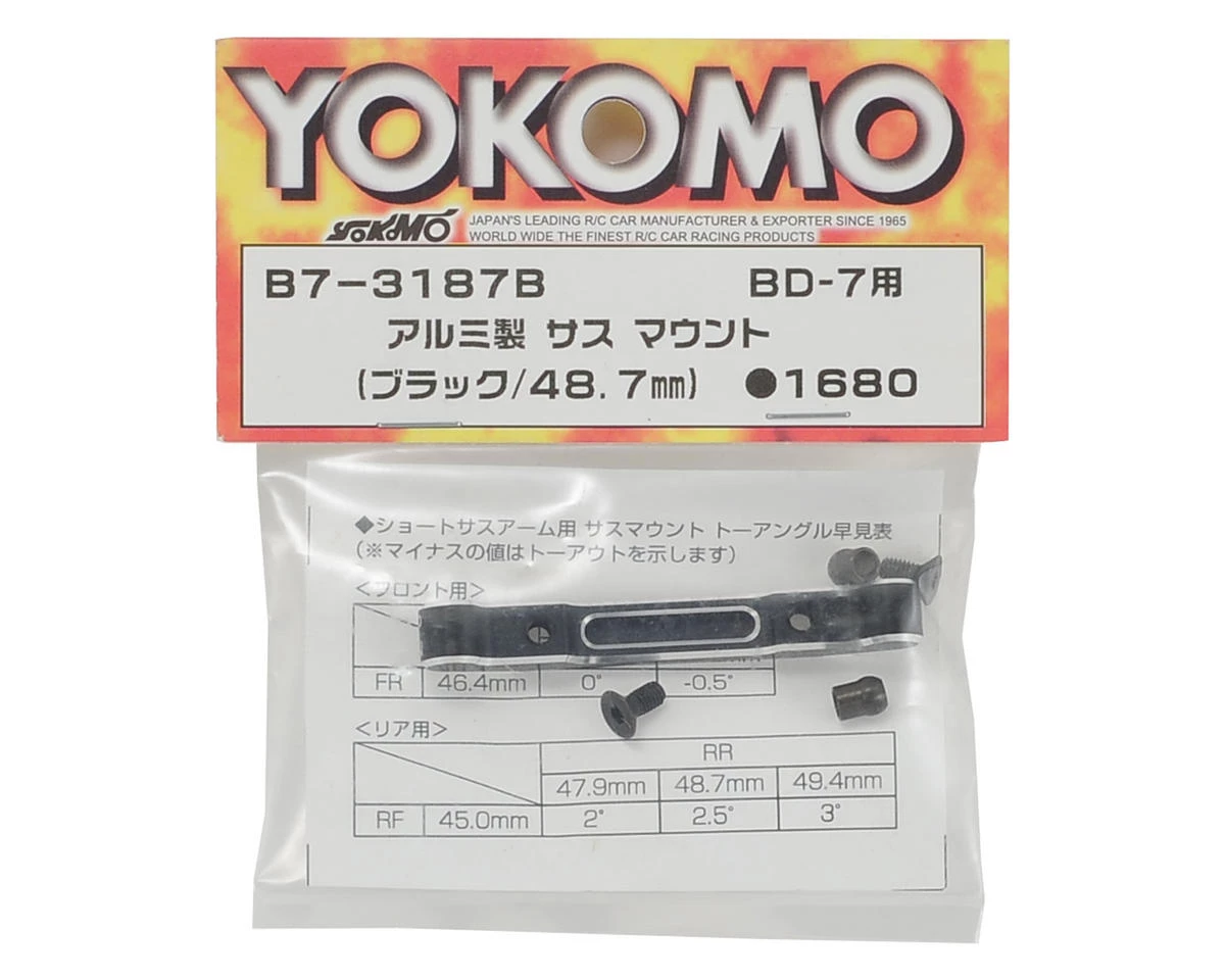 This is an optional Yokomo 48.7mm Aluminum Rear-Rear Suspension Mount. This block features a width of 48.7mm between the hinge pin holes. When combined with the rear front 45mm block (YOKB7-3150BS), provides 2.5° of rear toe.