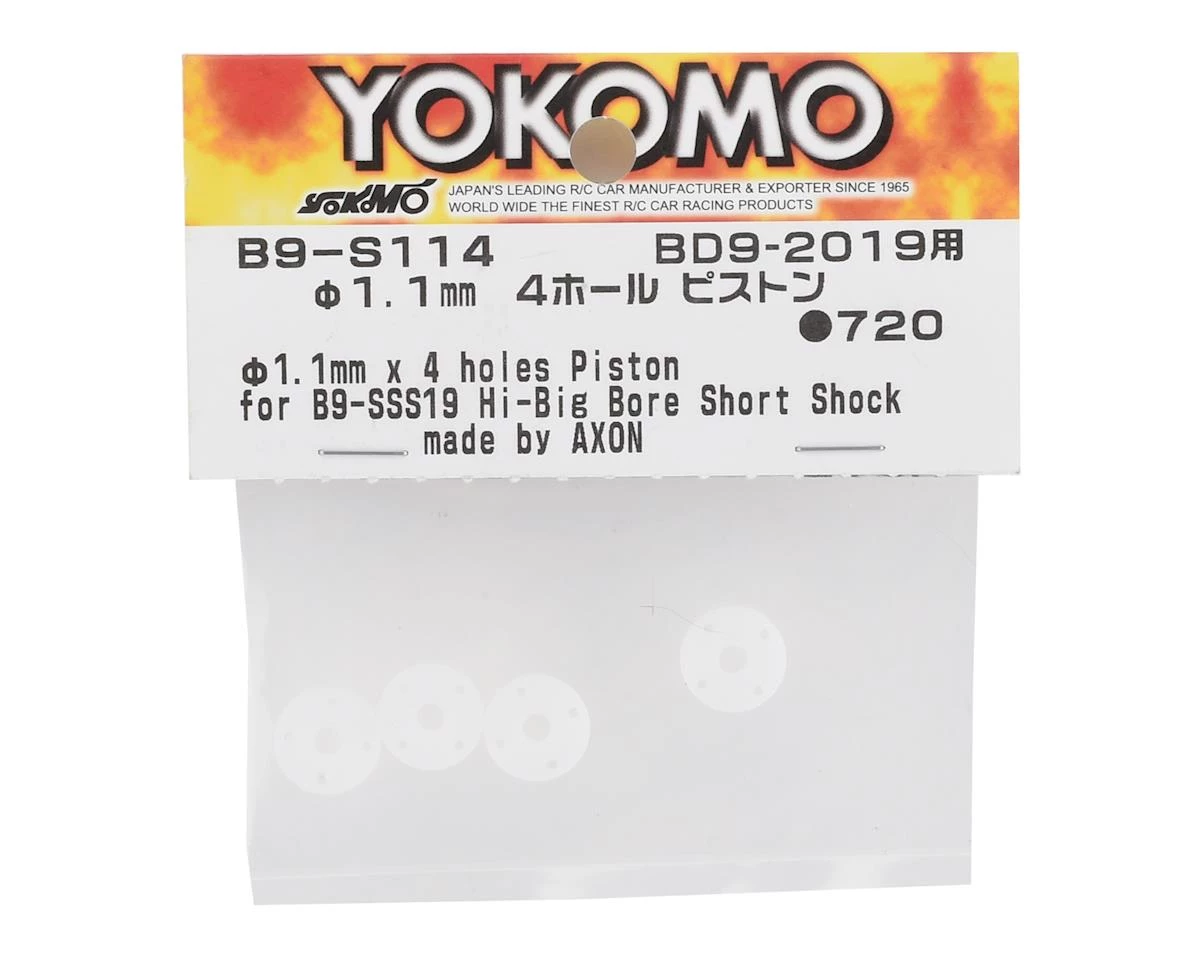 Yokomo BD9 4-1.1mm Hole Shock Piston. Package includes four, 4 hole shock pistons with 1.1mm holes, compatible with Yokomo short shocks.