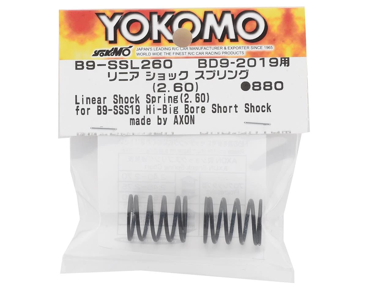Yokomo BD9 Big Bore Short Shock Linear Shock Springs were developed in collaboration with Axon. Package includes two 2.60 linear rate springs.Â