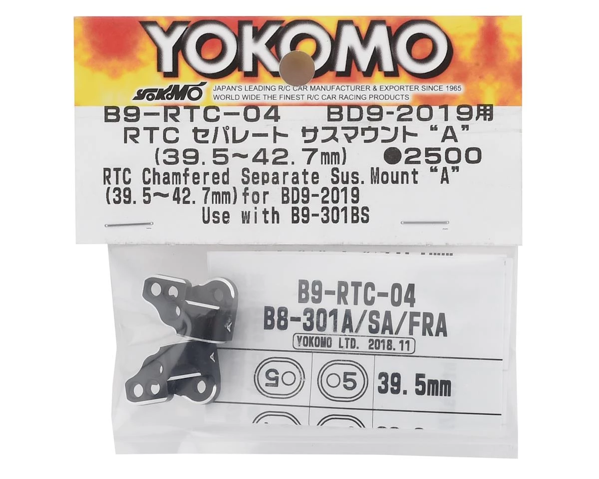 Yokomo BD9 RTC Separate Suspension Mount “A”. This is a replacement for BD9 models equipped with the Yokomo RTC Rear Toe Control System (YOKB9-RTC). Package includes two suspension mounts.