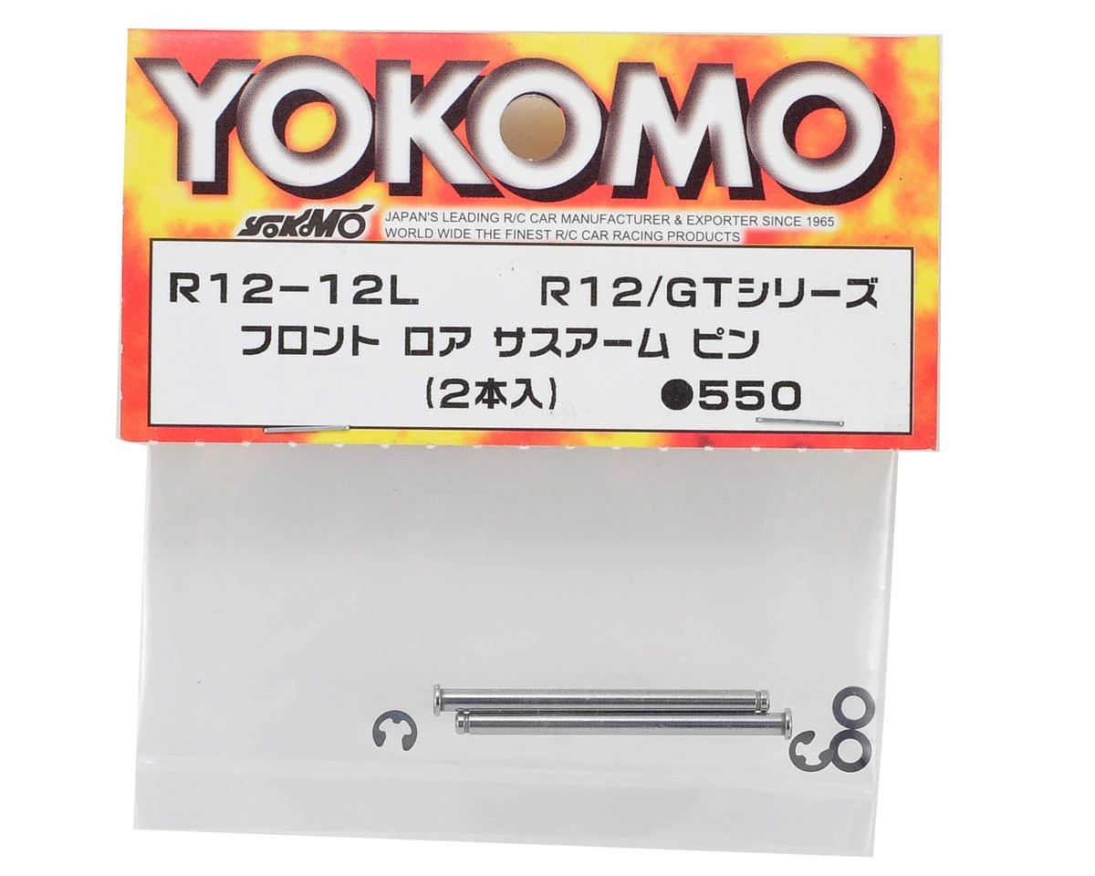 This is a replacement Yokomo Lower Front Suspension Arm Pin Set, and is intended for use with the Yokomo R12 1/12 scale pan car. This set includes two pins, two washers and two e-clips.Â