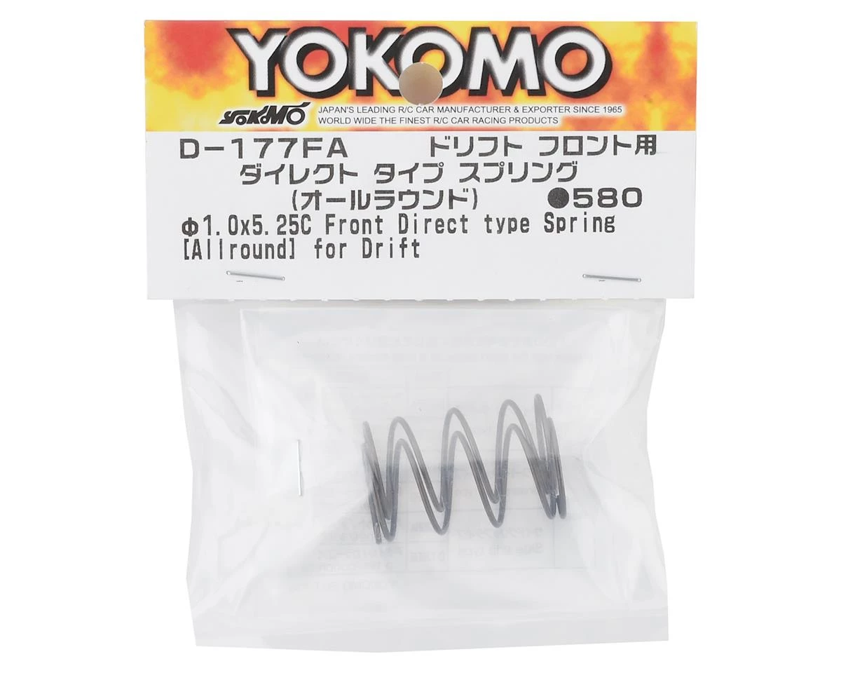 The Yokomo YD-2 Front Direct Type RWDÂ Drift Spring is a rough winding type with excellent response developed for RWD drift applications. This spring is designed to maximize the properties of the spring material by eliminating the paint from the surface. It responds sharply to steering input and improves driving feel with a high level of response. Even under high speed driving, understeer is not likely to occur. The all-round type is suitable for carpet and asphalt surfaces.