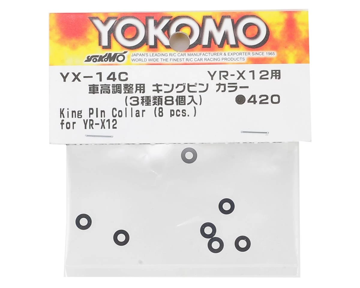 This is a pack replacement Yokomo YR-X12 King Pin Collar Set. This set includes a total of eight washers, four 1mm, two 2mm and two 3mm.